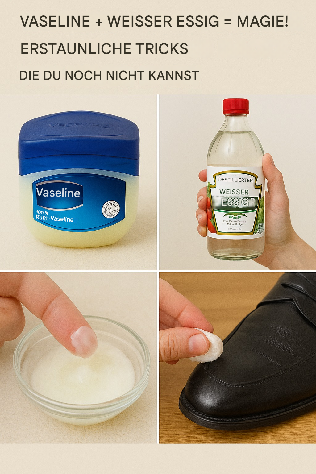 Möchten Sie Ihren Alltag vereinfachen und alltägliche Haushaltsprobleme mühelos bewältigen? Dann sind Vaseline und weißer Essig genau das Richtige für Sie. Die Kombination dieser beiden alltäglichen Produkte ist eine wahre Wucht und bietet eine Reihe von Lösungen, die Ihr Leben deutlich erleichtern. Entdecken Sie einige unglaubliche Tricks, die Ihren Alltag grundlegend verändern können.