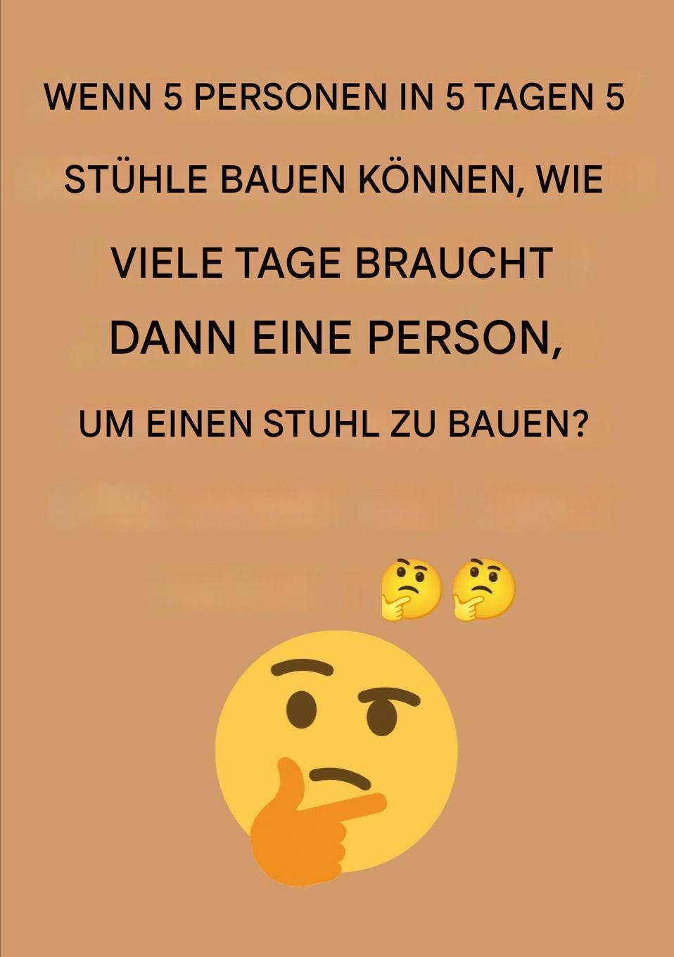 Ein Rätsel für die Intelligenten: 🤔🤔 👇👇 Wenn 5 Personen 5 Stühle in 5 Tagen bauen können, wie viele Tage braucht eine einzelne Person dann, um einen einzigen Stuhl zu bauen? Antwort: Auf der nächsten Seite: 5 Tage (jede Person baut einen Stuhl in 5 Tagen). Rätsel des Tages Rätsel: Ich bin ein Ding, das wächst, … Read more